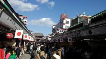 「浅草寺」は観光客でいっぱいでした。天皇誕生日と重なりましたので、参道の出店は、「日の丸」が掲げてありました。
