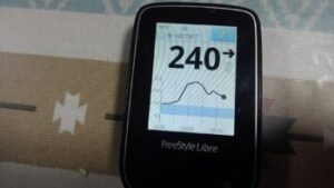 ・夕朝食前血糖値は高く、240mg/dlでした。(昼頃に缶コーヒーを1本飲みました。)