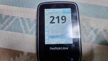 ・朝食前血糖値は高く、219mg/dlでした(昨夕食はカロリーが高かったようです。ご飯の量が多かったようです)。