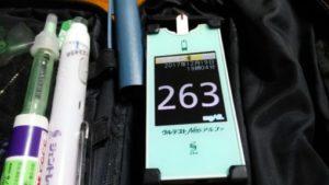 ・夕食前血糖値は高く、263mg/dlでした。昼食は1000キロカロリー以上あります。インスリン注射を3単位くらい増やさないといけないですが、カロリーが高いだけです。
