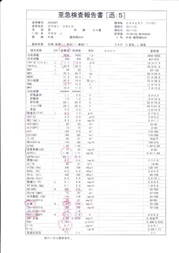 クレアチニンの値が少し下がりました。水分が良く採れていたせいかもしれません。中性脂肪の値も大幅に下がり、油物をあまり食べていないのも分かります。