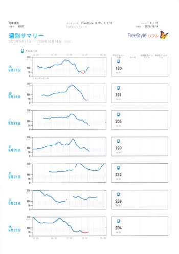 9月17日から10月14日までのグルコース値のグラフです。毎日24時間測定できるリブレのおかげですが、この値を参考にして、インスリン注射量を決めているつもりですが、グラフの結果通りにいかないのが、1型糖尿病の宿命です。