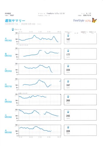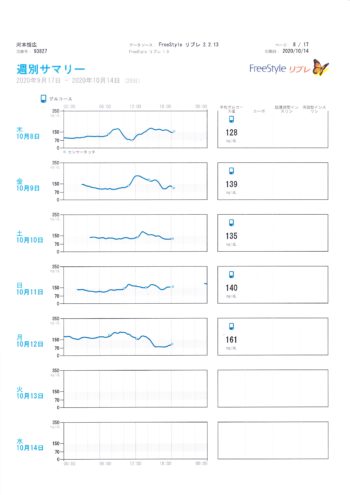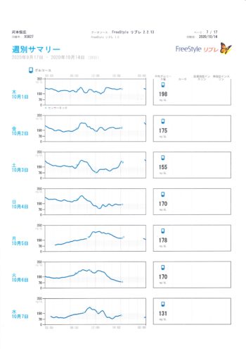 9月17日から10月14日までのグルコース値のグラフです。毎日24時間測定できるリブレのおかげですが、この値を参考にして、インスリン注射量を決めているつもりですが、グラフの結果通りにいかないのが、1型糖尿病の宿命です。