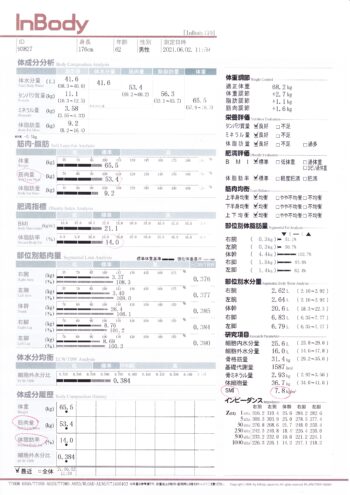 研究項目は、細胞内水分量、細胞外水分量、骨格筋量、基礎代謝量、骨ミネラル量、体脂肪量とも「標準値内でした。S M Iが7.8Kg/㎡でした。