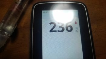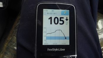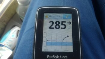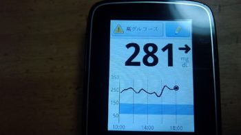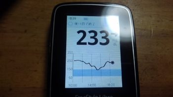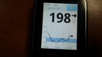 少し問題なのは、昼食前血糖値が261mg/dlと高すぎることです。朝食はいつもの通り、食パン1枚、サラダ、ヨーグルト、コーヒーなので、インスリン注射が利いていないような値でした。