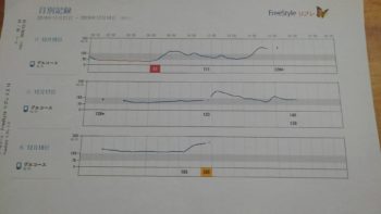 1ケ月分の細かいグラフです。高血糖や低血糖の時間込ごとの結果が、一目瞭然です。