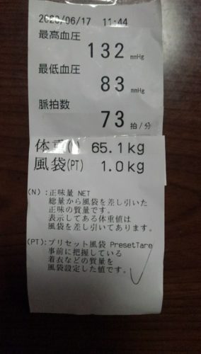 血圧は正常範囲で一安心でした。体重は実際は64Kgと前回より、2kg減りました。