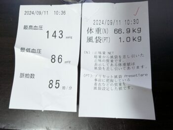 血圧と体重の画像です。血圧は上が143mmgで、下が86mmgでしたが、これは白衣高血圧だと思います。