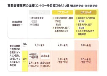上記の表のように、年齢的にHbA1cは、6.5が下限で、7.5未満で良いということで、私のようにHbA1cが6.0というまのは、低血糖が頻出していると解釈されるということです。