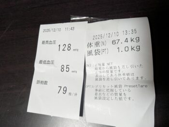 血圧と体重の画像です。血圧は少し高く、上が128mmgで、下が95mmgでした。少し高かったようです。