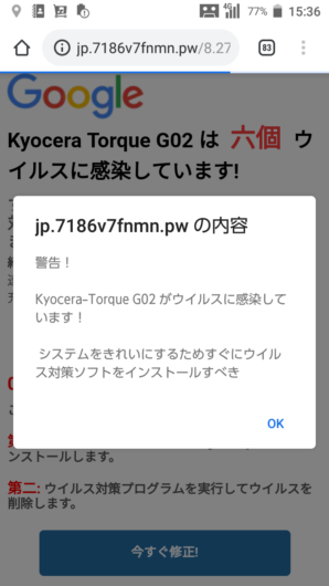 スマホの機種名を表示して「ウィルスに感染している」と表示される警告について