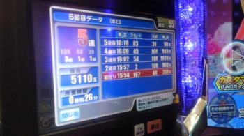 最初の5連時の差玉が最多でした。総投資が4.5Kで 回収がが5517玉の換金19.8Kのプラス15.3 Kでした。