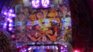 413回転、保留変化なし+「契約の刻(恨み晴らしの刻)」疑似連+蝶ギミック+お仕置き(三次元陶酔)リーチ「業の魂」→「1」当り。ヘソ保留なのでがっかりしていたら、40%の確変を当ててくれました。