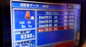 連チャンしないのは、「リンケージチャンスがない」「レルフラッシュがでない」「城門突破できない」がない台です。今日の台は、疲れていました。