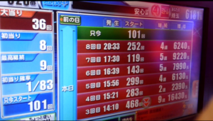 ニューギンの台は不得意です。ハマりと連チャンの差が激しいのです。好調台は常連が押さえていて、空きません。不調台に座ってずるずる打ち込むだけの日々です。