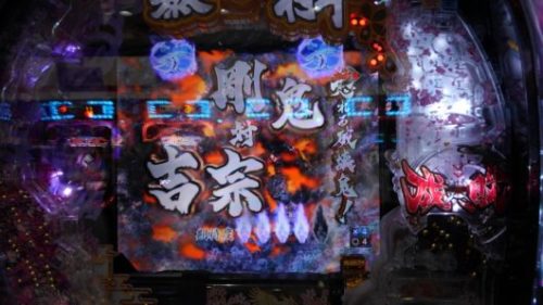 4連目は時短の「探索モード」中の76回転で、「刀」ギミック「赤」+「名言予告」「金」+「剛鬼」VS「吉宗」→「六」当たり。大当りラウンド後に昇格して、「殲鬼RUSH」に突入しました。
