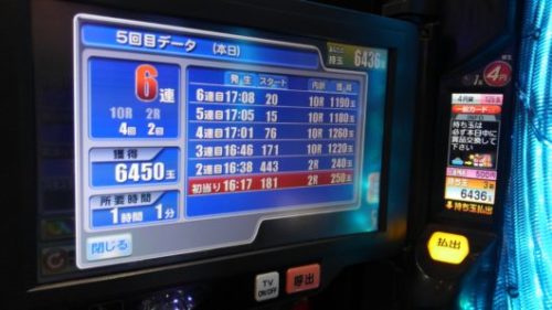 本日は、いつもの「CR ぱちんこAKB48-3 誇りの丘」を「カニ歩き」で5台も打ちましたが、ヒットなしでした。後でチェックすると1台目に打っていたシマ一番の15回当たりの台が、すぐに当たって6連していました。狙いはあっていたのですが、我慢できずに辞めました。