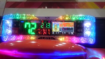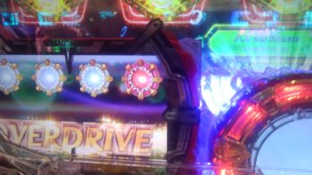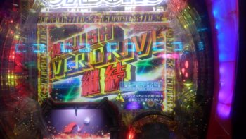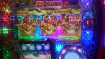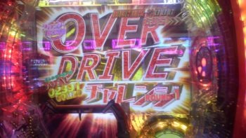 「バカンスモード」の82回転、「緑」保留+5択リーチ+☆×2の?リーチ+一撃→「3」3R確変当たり。「加速RUSH OVER DRIVE」に突入しました。