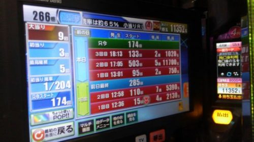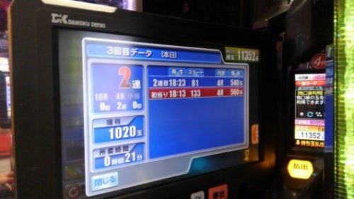 174回転まで回しましたが、その後は何もありませんでした。総投資が2Kで 回収がが11352玉の換金40.8Kのプラス38.3 Kでした。
