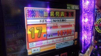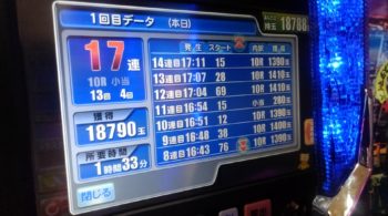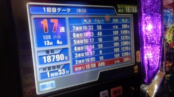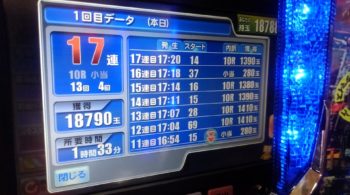 18連目は、大当たりせずに、スルーしました。17連で出玉が20499玉でした。