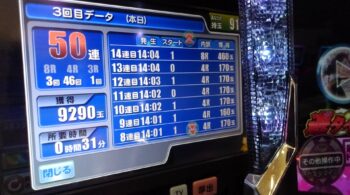 この後55回転まで回して、やめました。この数珠繋ぎ時に「満開モード」に入ってくれれば、大勝ちできたはずですが、そうはうまくはいきませんでした。