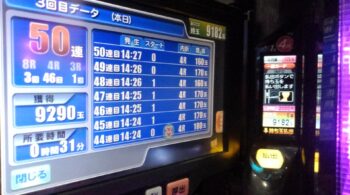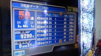 一撃50連時は、出玉が11500発、差玉でも9182発出ました。