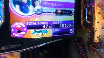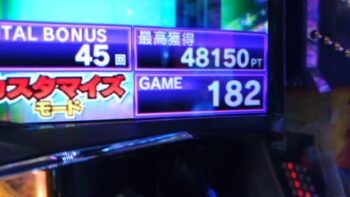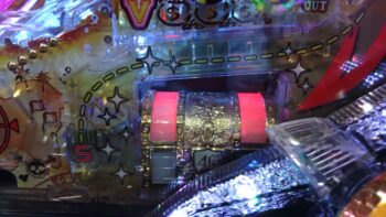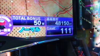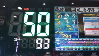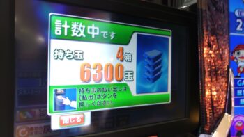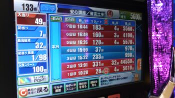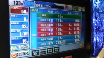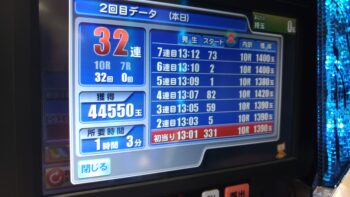 前々日9回、前日27回の台で、初当たり、1回目が28回転で3連、2回目が331回転で32連、3回目が233回転で通常当たり、4回目が37回転で通常当たり、5回目が28回転で4連、6回目が160回転で3連で168回転で空いていました。ここまで45回当たりだったということです。