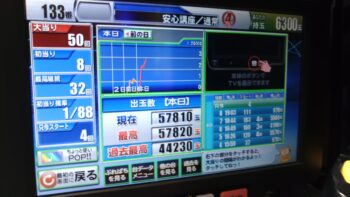 本日は、一撃32連チャンで出玉が48000発の爆発台が、その後も当たり続けて放置されていたので座りました。出玉グラフは全遊戯終了時です。