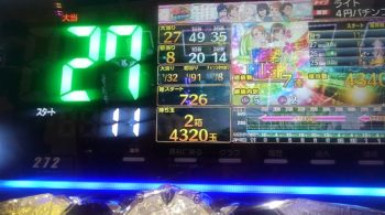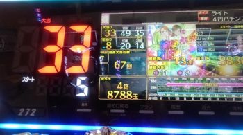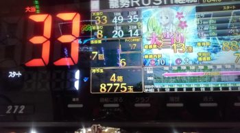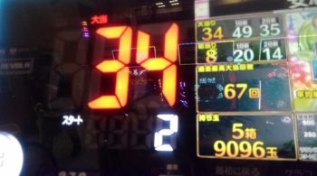 差玉3000玉を持って、いろいろ「カニ歩き」しましたが、当たっても連チャンせずで差玉も消失しました。とんでもなく派手な台であることは分かっています。初当たり1回目が4連。2回目が303回転で3連。3回目が86回転で単発スルー。4回目が70回転で単発スルー。5回目が87回転で4連。6回目が54回転で6連。7回目が38回転で単発スルー。11回転で空いていました。