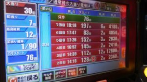 105回転の台を回すこと197回転に「お突」を捕らえて4Rです。無事に6連(4R×5、16R×1)して4180玉プラスの合計5700玉強でした。