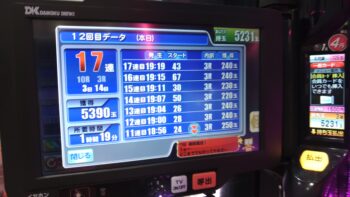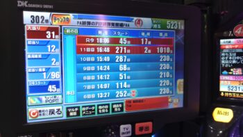 本日、初当たり1回目が、9回転で2連、2回目が90回転で単発スルー、3回目が154回転で単発スルー、4回目が132回転で単発スルー、5回目が78回転で2連、6回目が252回転で単発スルー、7回目が、114回転で単発スルー、8回目が51回転で単発スルー、9回目が、68回転で単発スルー、10回目が、271回転で2連、180回転で空いていました。最悪な履歴でしたが、「遊タイム」狙いですね。