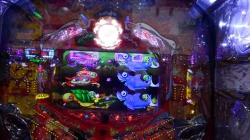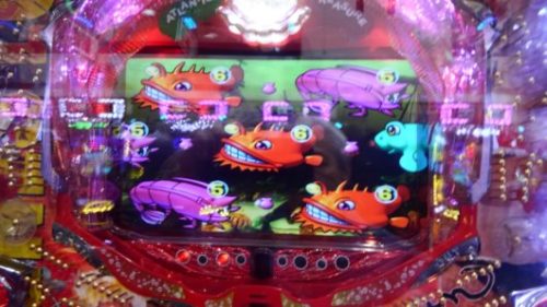 この大当たのラウンド中にいきなりマリンちゃんが現れて「ジュゴン」図柄をプレゼント。保留2個目が点滅しました。こういう演出があるのが爆発台なのです。