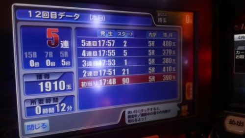 2連目が21回転で4R。3連目が1回転で4R。4連目が5回転で4R。5連目が2回転で4R。出玉が恵まれませんでしたが5連してくれました。