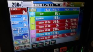 もう1台ですが、本日の1回目初当りが、17回転で4連。2回目が141回転で8連。3回目が255回転で6連した好調台でした。前日が787回転で、通常当りのハマり台でした。