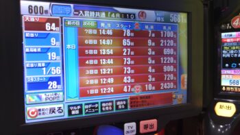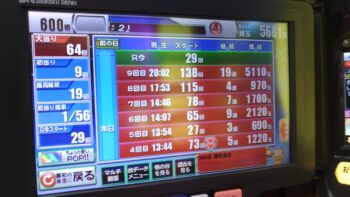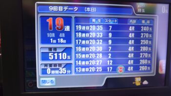 良さげな台があったので座りました。前々日30回、前日78回の台で、初当たり1回目が47回転で10連、2回目が43回転で3連、3回目が73回転で4連、4回目が73回転で5連、5回目が27回転で3連、6回目が65回転で9連、7回目が78回転で7連、8回目が115回転で4連してここまで45回当たりで、116回転の台でした。