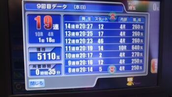 11連目は14回転、10R確変当たり。12連目は46回転、4R確変当たり。13連目は17回転、4R確変当たり。14連目は12回転、4R確変当たり。15連目は2回転、4R確変当たり。16連目は7回転、4R確変当たり。17連目は9回転、4R確変当たり。18連目は9回転、4R確変当たり。