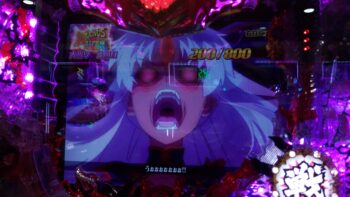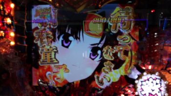 投資1.5Kの24回転、入賞時フラッシュ「白」+「ピンク」桃保留「ドキドキ」++連続斬撃予告「鬼姫」+「三神憑依リーチ」+「赤」カットイン→「一」4R当たり。