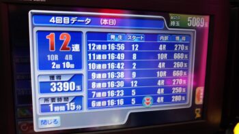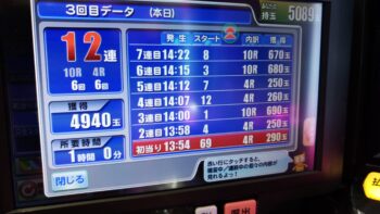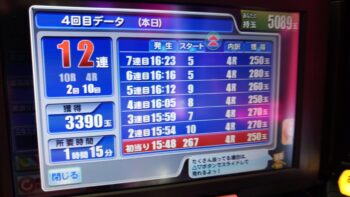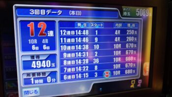 12連して「即ヤメ」しました。総投資が3Kで、回収が5089玉の換金18Kで、プラス15Kでした。