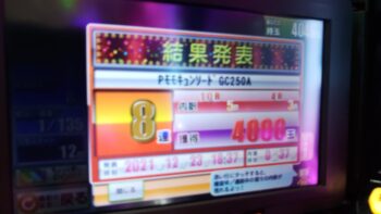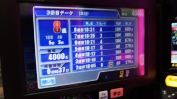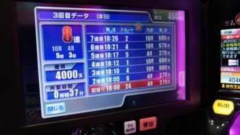 下の終了画面でも、平均連チャン回数より上です。この画像は、すべて同じ大のものです。