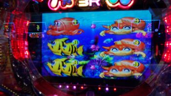 2連目は11回転で「ヤッコ」5R通常当たり。3連目は時短1回転、一発告知+魚群+マリンリーチ→「カメ」当たり。4連目2回転、5R当たり。