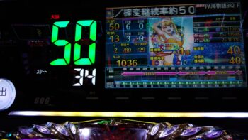 この8連後の時短をスルーしたのですが、その保留の34回転、一発告知「ロング」+右タテ「カニ」+黒潮リーチ→「カニ」5R確変当たりで引き戻しました。好調台はこういう怪しい当たりが、多々あります。