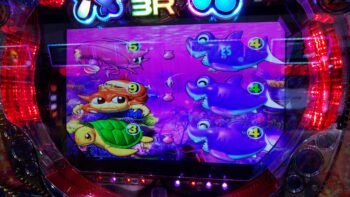 「お座り一発」は決まらずでしたが、適度にスーパーリーチに行くので、頑張って回した133回転、背景暗転プレミア+一発告知「ロング」+泡+「カメ」×「サメ」+ノーマルリーチ「走り」→「カメ」当たり。