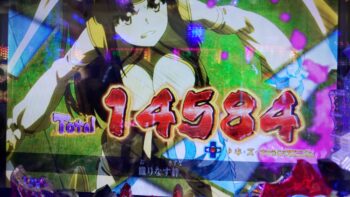下記結果表示ですが、甘デジと思えないものです。14584発の表示と液晶の大当たりアイコンです。