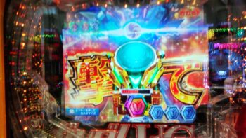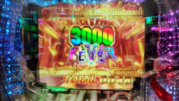 投資1Kの364回転から374回転、 レバブル+「赤」保留+疑似連×3+ 強背景予告 + ガンダムユニコーン予告 +ギミック決戦+MSバトルリーチ→「3」→「7」「3000FEVER」。総投資4Kなので、もうプラスとなりました。