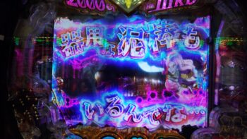 不二子ZONEか「神髄演出」がないと厳しいのですが、当たってほしかったリーチでした。この後も大泥棒ZONE+疑似連×3+バトルSPリーチのチャンスアップなし→外れ等がありましたが止めたら、この台がすぐに当たっていました。