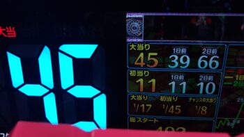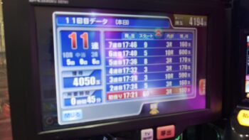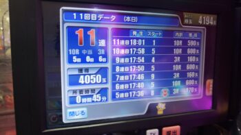 空いていたのは、前々日66回、前日39回の台で、初当たり1回目が15回転で単発スルー、2回目が11回転で単発スルー、3回目が24回転で8連、4回目が18回転で単発スルー、5回目が113回転で3連、6回目が23回転で2連、7回目が25回転で2連、8回目が64回転で、2連、9回目が45回転で12連、10回目が194回転で単発スルーの台