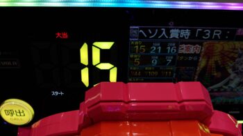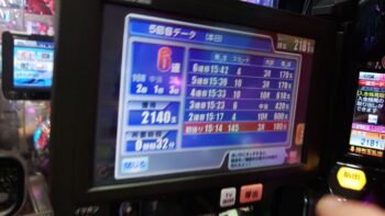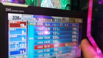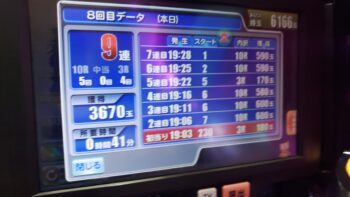 前々日32回、前日16回の台で、初当たり1回目が120回転で単発スルー、2回目が58回転で単発スルー、3回目が98回転で4連、4回目が183回転で単発スルー、5回目が235回転で単発スルー、6回目が121回転で単発スルー、7回目が111回転で単発スルー、168回転で空いていました。履歴では最悪な台でしたが、「遊タイム」狙いです。