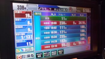 簡単なことですが、大当たりラウンド後にすぐに打ち出すより「RUSH」突入率が飛躍します。上記の3台は、ほぼ「RUSH」に入れています。