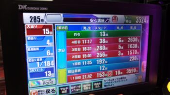 前々日16回、前日21回の台で、昨日に筆者が9連した台でした。履歴の画像がなかったのですが、計、9回当たりで68回転で空いていました。