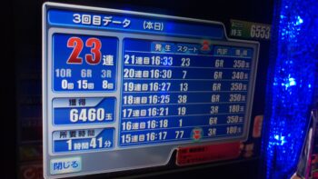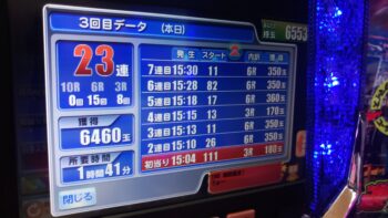 6連目は82回転、 11連目は79回転、13連目は68回転 15連目は77回転で引き戻していますが、13連目は効果があると言えます。時短終了間近で当たるのは、爆連台でよくある怪しい当たりです。